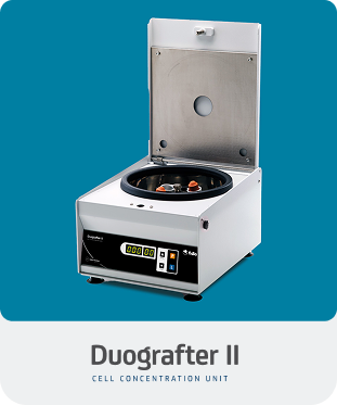 DUOGRAFTER II is a tabletop centrifugation unit intended to process human tissues, such as blood, bone marrow and adipose tissue through two different centrifugation programs, “P” for blood and “L” for bone marrow and adipose tissue, preconfigured by the manufacturer and not adjustable by the user1